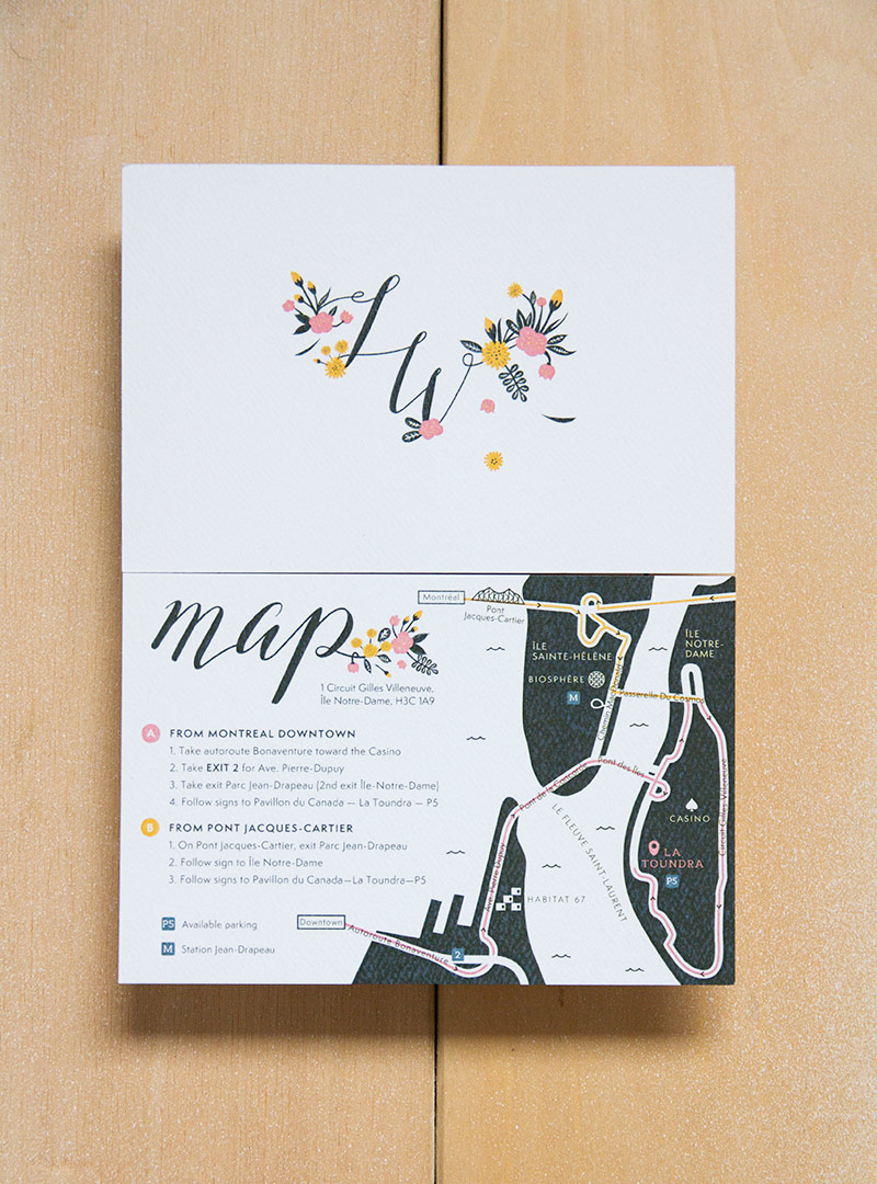 happiness and gallantry respectively. The three-piece set contained the main, the map and the rsvp card.