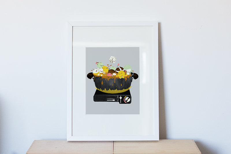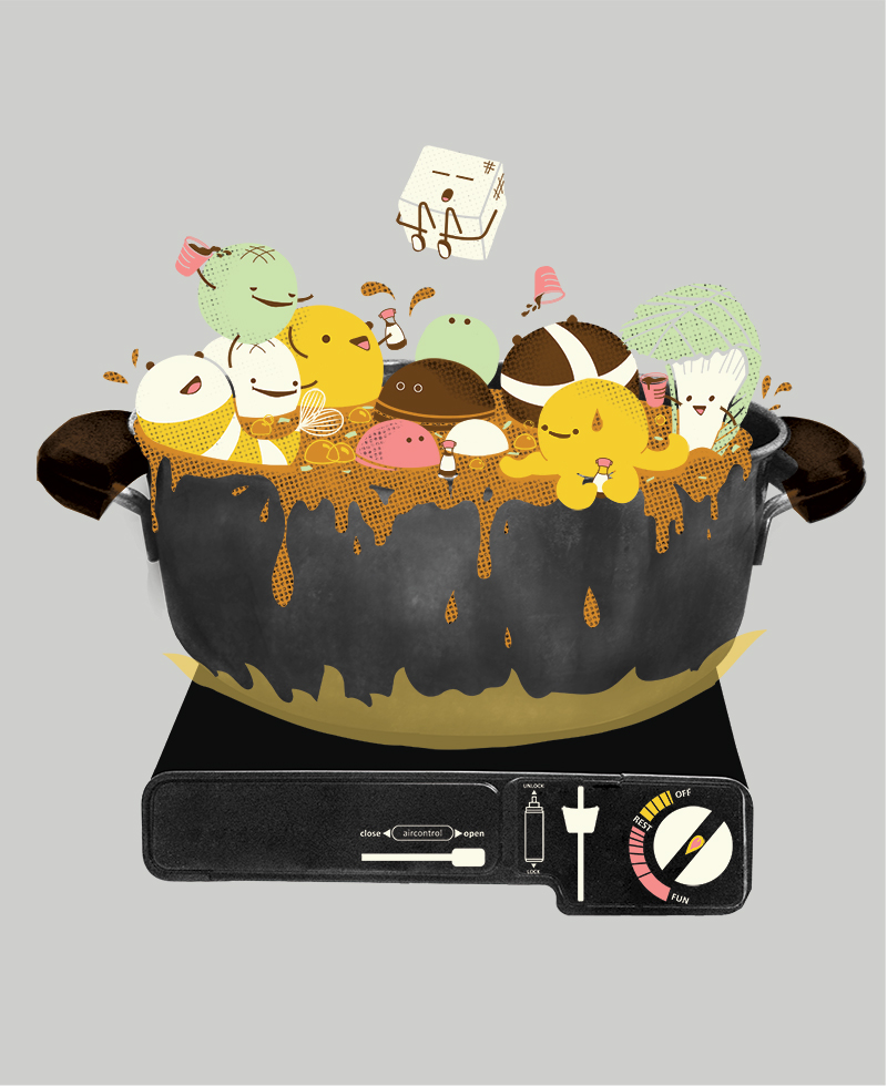 big pot of boiling stock that sits on top of a butane gas stove. My imagination took over and this is the result.
