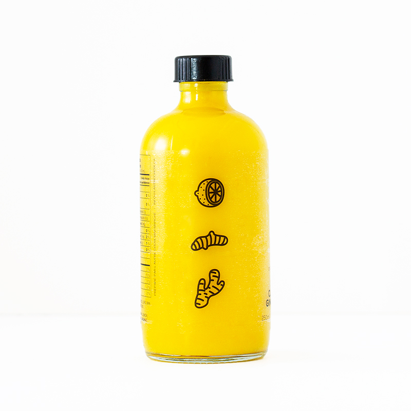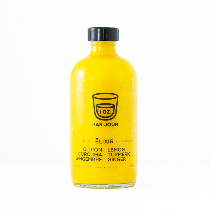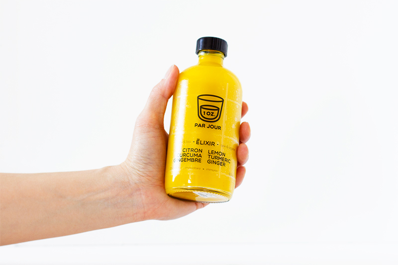 Un Once Par Jour, or as it is called in English, One Ounce A day, is an immune boosting tonic made from ginger, lemon and turmeric, giving the bottle its vibrant yellow. To let the colour do most of the talking, the graphics and typography were kept direct, uncomplicated, and easy to read.